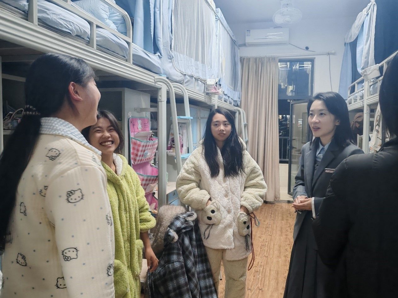 在女生寝室的走访过程中,陈心心一行与学生亲切交流,深入关心了解学生的心理状态与宿舍生活情况。老师们倾听学生心声,针对学生提出的课程学习、生活习惯等方面存在的困难,结合心理疏导与日常关怀,为学生一一答疑解惑。同时,老师们还结合国家对教育的重视和对大学生的关心关爱,开展爱国主义教育,引导学生树立家国情怀,鼓励青年将个人成长融入国家发展。