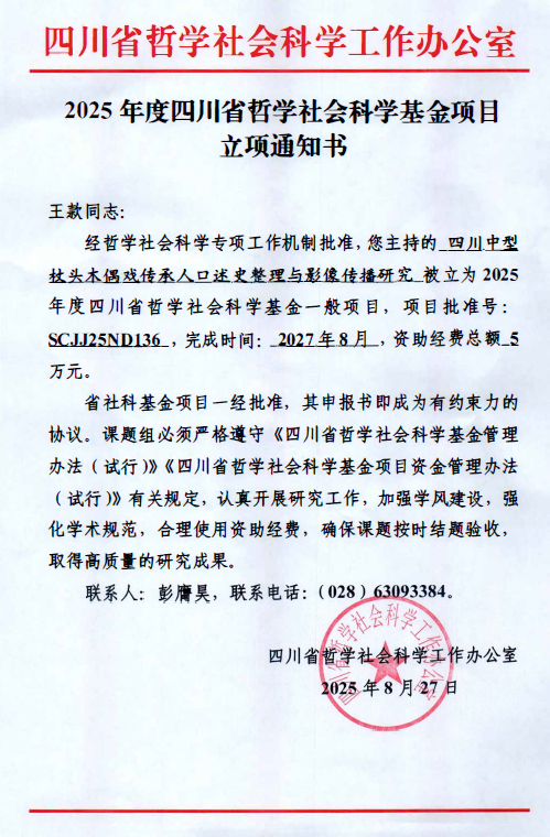 近日,省哲学社会科学工作办公室公布了2025年四川省哲学社会科学基金一般项目立项名单,我院王款老师担任负责人的研究项目《四川中型杖头木偶戏传承人口述史整理与影像传播研究》获得立项,项目批准号: SCJJ25ND136,项目获得资助经费5 万元。