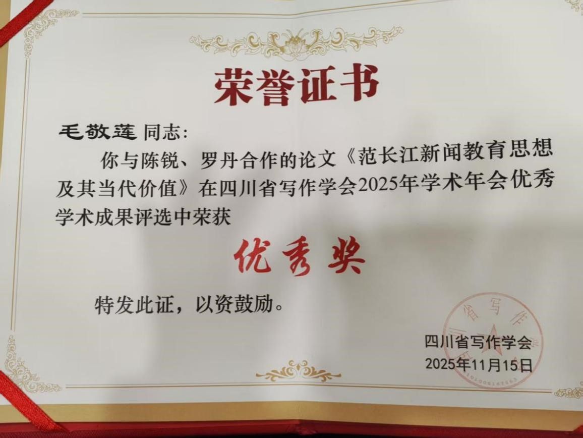 11月15日,以“探讨写作学科理论前沿问题及AI技术在写作领域的应用”为主题的四川省写作学会2025年学术年会在电子科技大学隆重举行。我院高卫红教授、毛敬莲老师与文学院黄全彦教授组成老中青三代学术团队参会,其中范长江新闻学院两篇参赛论文凭借鲜明的时代价值与扎实的研究功底,双双斩获优秀论文奖;毛敬莲还作为青年教师代表登台发言。