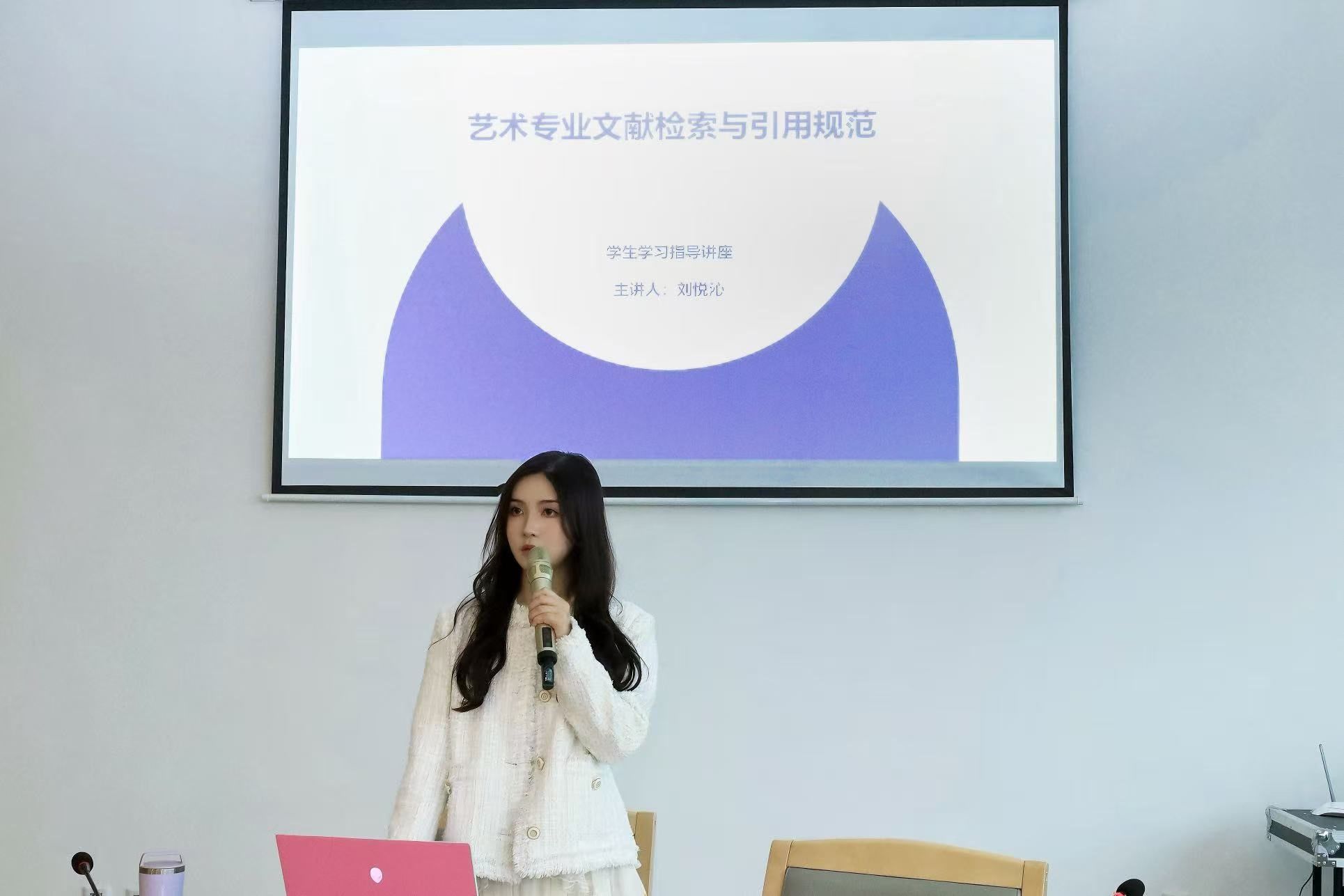 讲座伊始,刘悦沁老师立足艺术专业学科特性,深入阐释文献检索与规范引用在学术研究、论文撰写、艺术创作实践中的核心价值,着重强调严谨的文献使用与规范引用是坚守学术诚信、保证研究质量的重要前提,引导学生树立正确的学术观念。