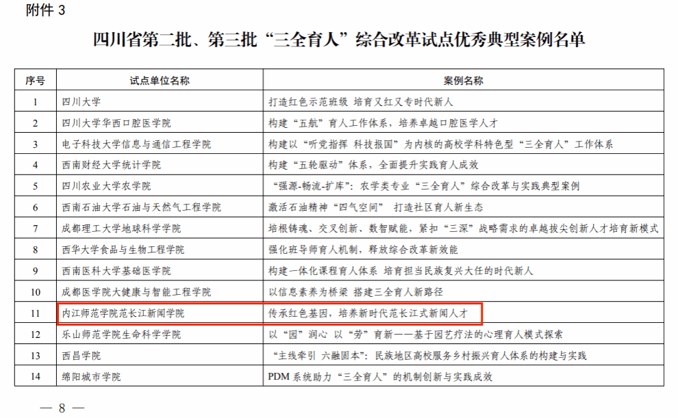 近日,四川省委教育工委公布了第二批、第三批“三全育人”综合改革试点总结评审结果,我院报送的案例《传承红色基因,培养新时代范长江式新闻人才》成功入选全省“三全育人”综合改革试点优秀典型案例。